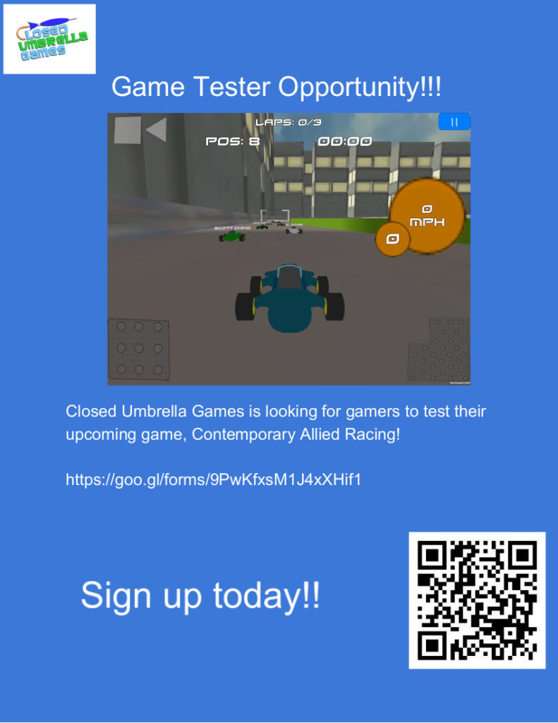 Hi to our fans! We are pleased to announce that our upcoming game, Contemporary Allied Racing, is now ready for testing! We still have a couple things to clean up before submitting the game for review. In the meantime, we’re looking for talented gamers to test the game for any bugs and feedback. If you would like to be a tester, you can sign up right here!